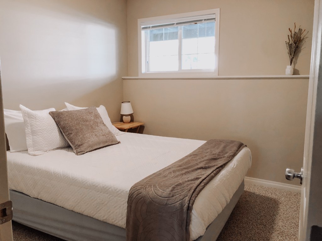 The third and fourth bedroom each have a queen bed. The fifth bedroom has a king bed. The sixth bedroom has a queen bed with closet space available. The basement has its own bathroom with shower and tub, as well as a small living area.